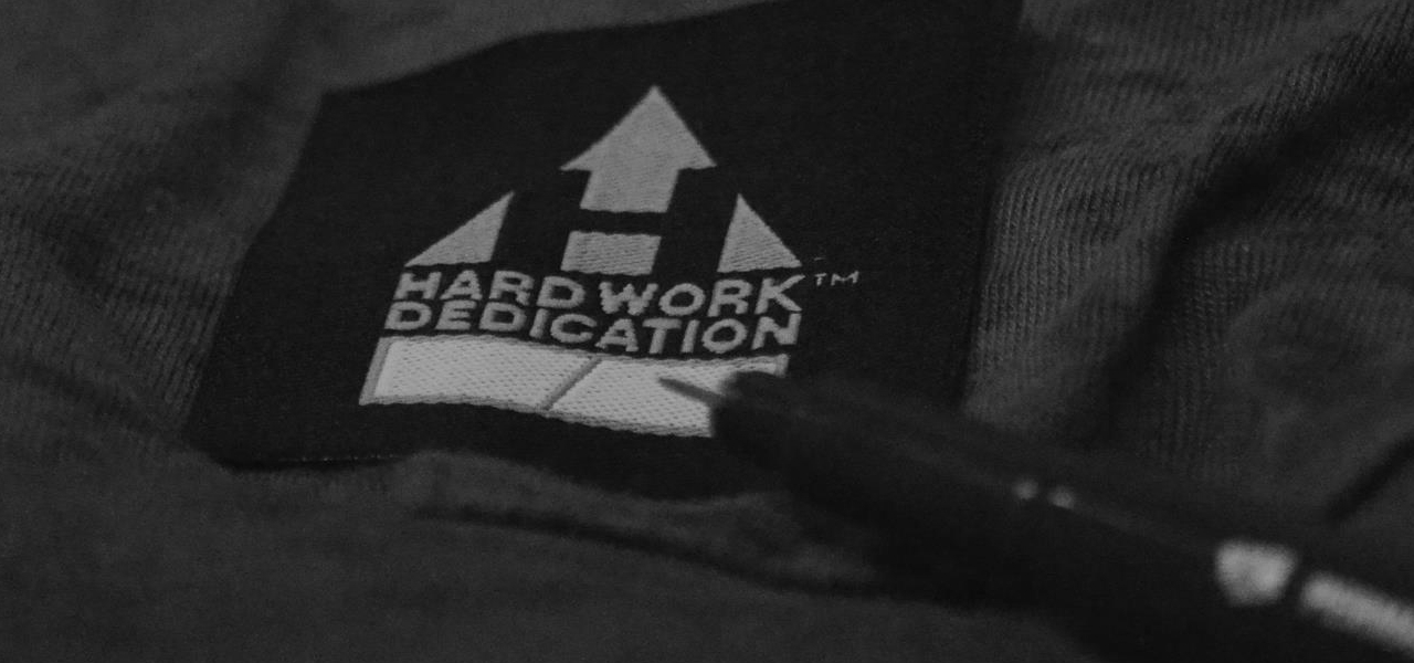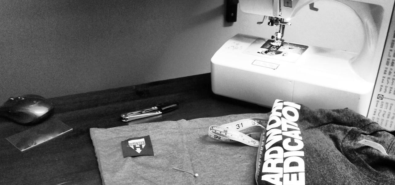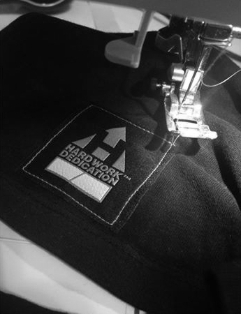 Sewing the HARD WORK DEDICATION label for the limited run.